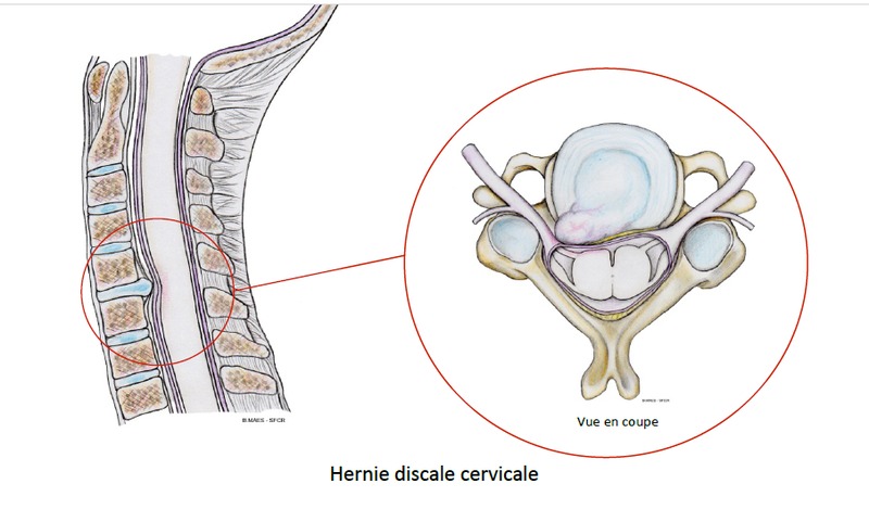 La compression d’une racine nerveuse va entraîner une Névralgie Cervico-Brachiale (NCB) – équivalent d’une « sciatique » du bras – avec une douleur irradiant sur, plus ou moins, l’ensemble du membre supérieur jusqu’aux doigts. Cette douleur peut s’accompagner de troubles de la sensibilité de type fourmillements ou picotements (paresthésies), des sensations de perturbations de la sensibilité (impression de gros doigt) (dysesthésies), pouvant aller parfois jusqu’à la perte de la sensibilité (anesthésie). Il peut exister aussi des troubles de la motricité (simple sensation de faiblesse, voire perte de la force musculaire pouvant aller parfois jusqu’à une paralysie partielle ou complète d’une partie du membre supérieur.