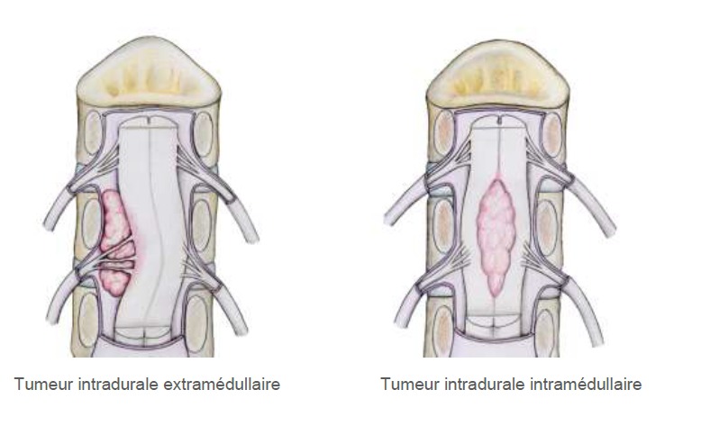 Elle a pour but de retirer la tumeur et de libérer le tissu nerveux (moelle épinière ou nerf de la moelle). Le chirurgien accède à la tumeur selon le trajet le plus court possible, en s’aidant de la radiographie avant ou pendant l’intervention pour repérer le bon niveau. La plupart du temps l’incision est au milieu du dos. Pour des tumeurs situées en avant ou sur le côté de la moelle, il peut arriver que l’incision soit sur le côté au niveau du cou, du tronc ou du ventre en fonction du niveau concerné. Pour accéder à la tumeur, le chirurgien doit retirer une partie des vertèbres, qu’il remettra en place en fin d’intervention si nécessaire. Si la tumeur est « accrochée » à la dure-mère (méningiome), cette partie de la méninge est retirée et le defect est remplacé par de la dure-mère synthétique. Si la tumeur est développée au dépends d’un nerf, il peut arriver de le sectionner, en général sans conséquence pour le patient. Si la tumeur est dans la moelle, il est alors nécessaire de se créer un passage au sein de celle-ci, ce qui peut avoir des conséquences neurologiques.